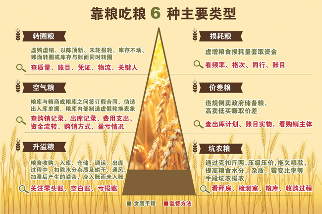 梳理各地案件,“转圈粮”“空气粮”“升溢粮”“损耗粮”“价差粮”“坑农粮”等六类“靠粮吃粮”腐败问题最为典型,成为各地当前深挖细查的重点。