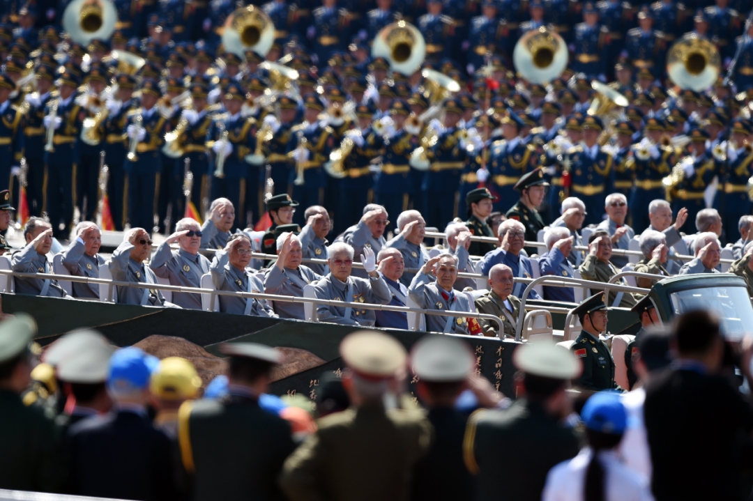 2015年9月3日,中国人民抗日战争暨世界反法西斯战争胜利70周年纪念大会在北京隆重举行。这是抗战老兵乘车方队通过天安门广场。新华社记者 王定昶 摄
