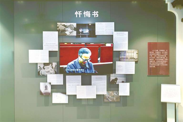 图为浙江省嘉善县警示教育基地“以案为鉴,警钟长鸣”板块中的“忏悔墙”场景,墙上展示的是近年来查处的部分党员干部的忏悔书。 周悦怡 摄