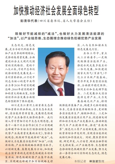 《人民日报》3月8日刊发全国人大代表,四川省委书记、省人大常委会主任彭清华署名文章《加快推动经济社会发展全面绿色转型》。